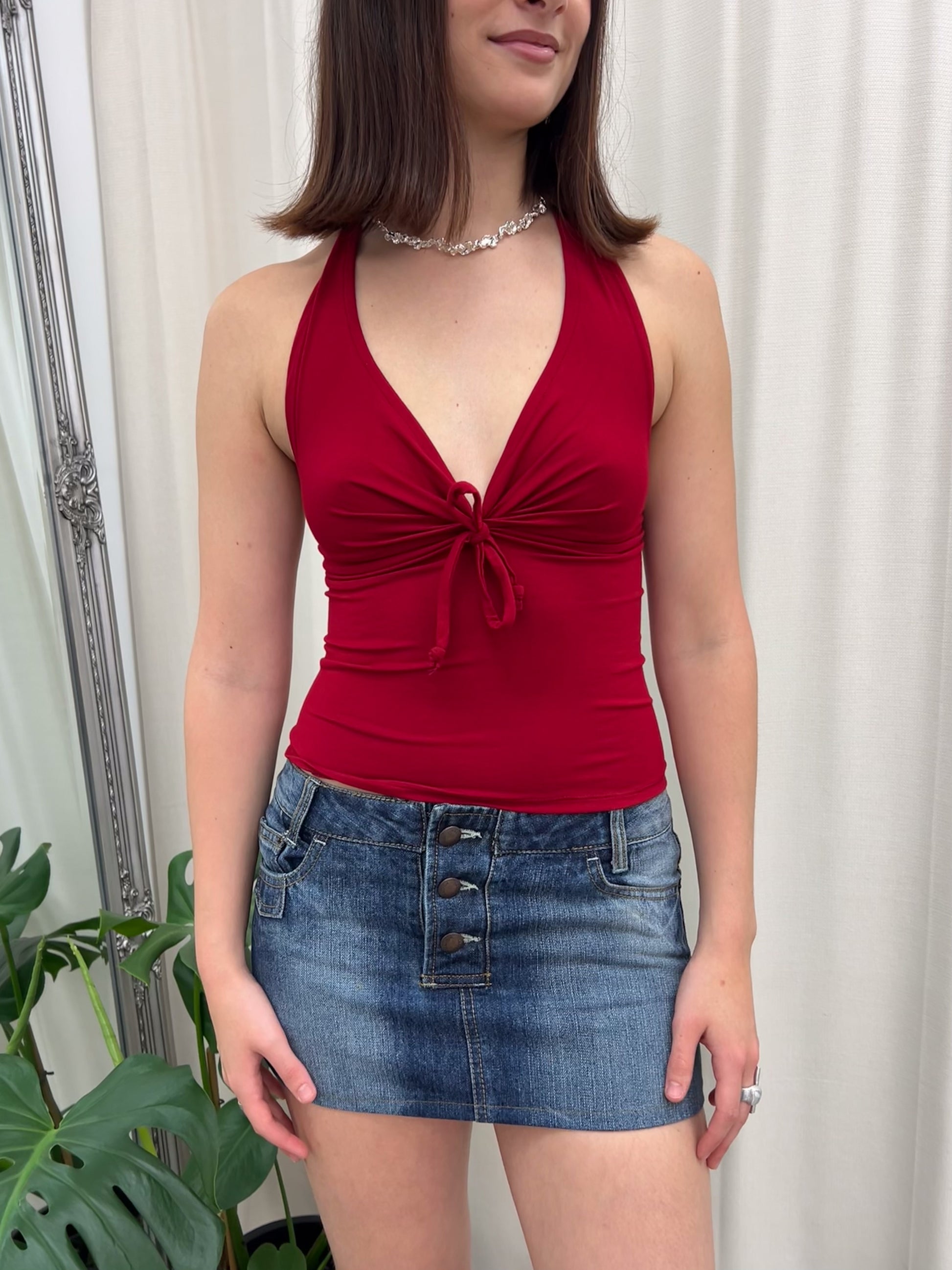 Product details: V neck halter top with gathered tie at bust. Fabric is a super buttery, soft stretch.