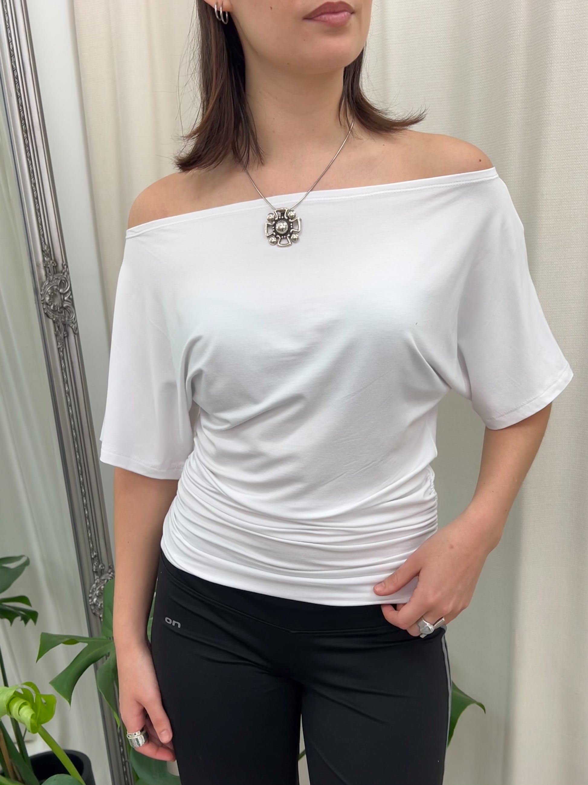 Product details: Draped off shoulder top with elasticated ruching down the side seams. Fabric is a super soft, buttery stretch.
